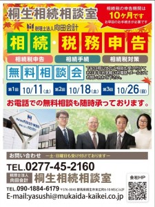 桐生みどり、太田、伊勢崎、前橋フリモ10月号に相続・税務申告無料相談会の紹介を掲載させていただきました。