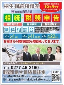 桐生みどり、太田、伊勢崎、前橋フリモ2月号に相続・税務申告無料相談会の紹介を掲載させていただきました。 第1回 2月1日(土) 第2回 2月11日(火・祝) 第3回 2月22日(土) ※上記日程以外のご相談も受け付けております。お気軽にお電話・メールにてお問い合わせください。