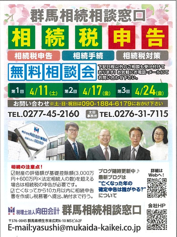 桐生みどり、太田、伊勢崎、前橋フリモ4月号に相続・税務申告無料相談会の紹介を掲載させていただきました。