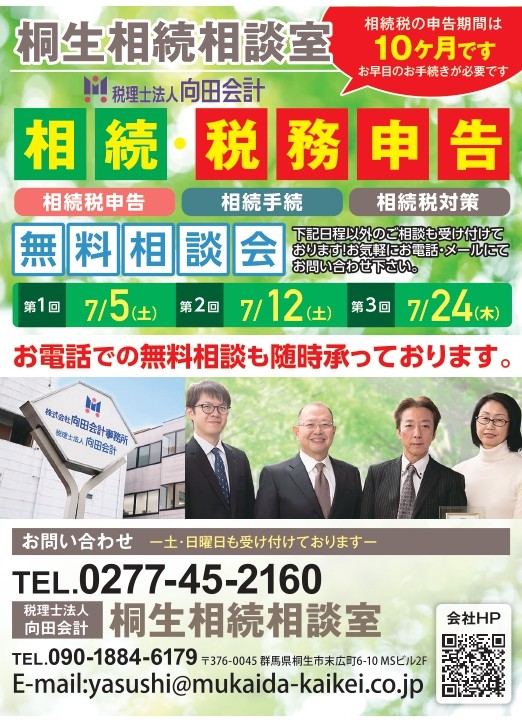 桐生みどり、太田、伊勢崎、前橋フリモ7月号に相続・税務申告無料相談会の紹介を掲載させていただきました。 第1回 7月5日(土) 第2回 7月12日(土) 第3回 7月24日(木)
