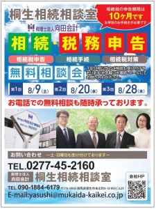 桐生みどり、太田、伊勢崎、前橋フリモ8月号に相続・税務申告無料相談会の紹介を掲載させていただきました。 第1回 8月9日(土) 第2回 8月20日(水) 第3回 8月28日(木)