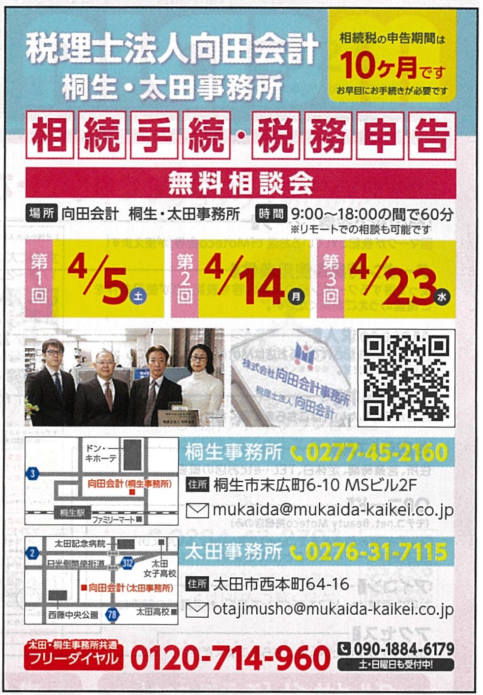 モテコ4月号に相続・税務申告無料相談会の紹介を掲載させていただきました。 第1回 4月5日(土) 第2回 4月14日(月) 第3回 4月23日(水) ※上記日程以外のご相談も受け付けております。お気軽にお電話・メールにてお問い合わせください。