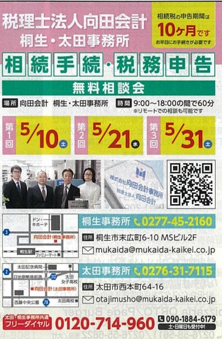 モテコ5月号に相続・税務申告無料相談会の紹介を掲載させていただきました。 第1回 5月10日(土) 第2回 5月21日(水) 第3回 5月31日(土) ※上記日程以外のご相談も受け付けております。お気軽にお電話・メールにてお問い合わせください。